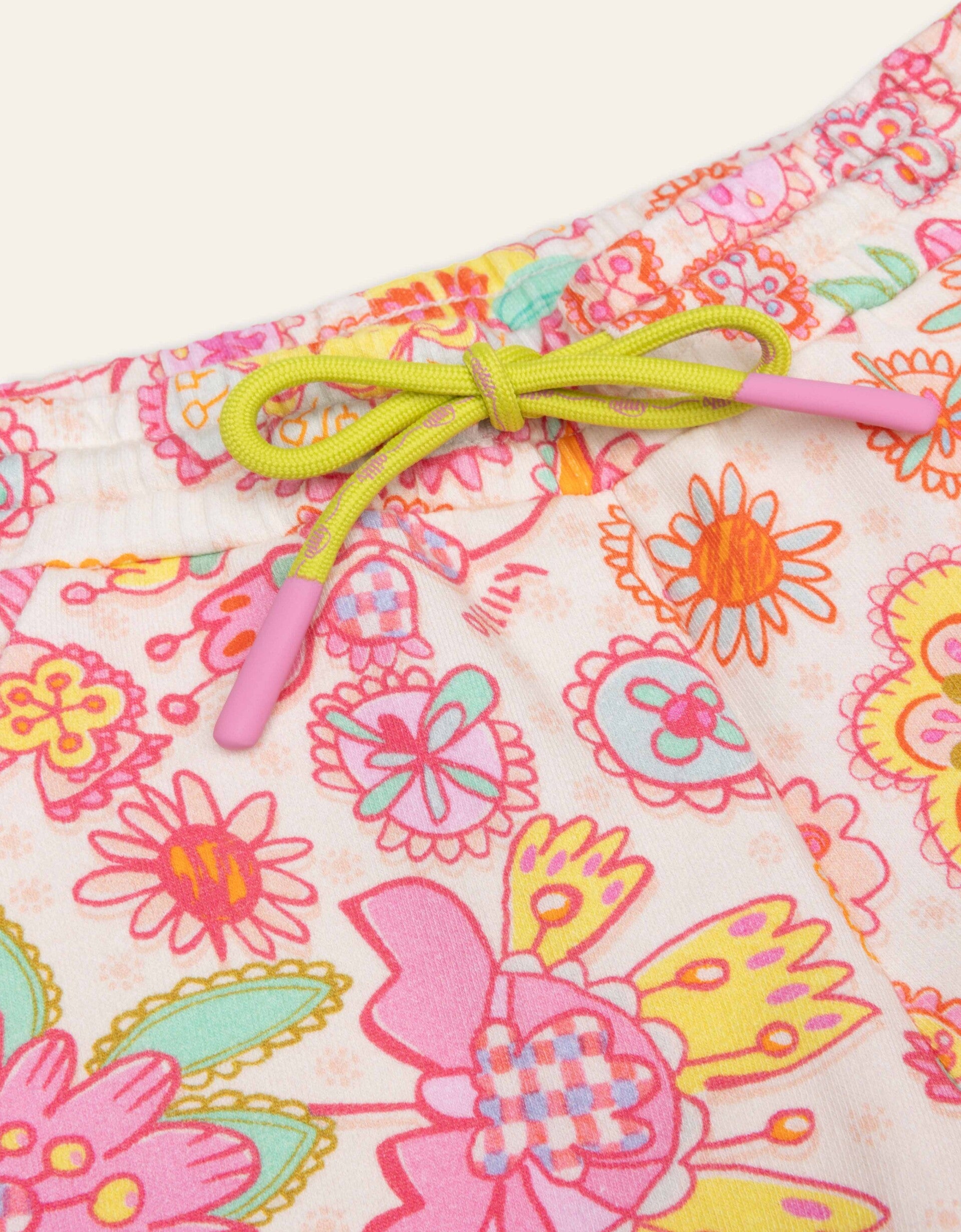 De bloemetjes op deze losvallende broek van joggingstof zijn van ons Alexi dessin. Een dessin uit 1992 dat we opnieuw hebben getekend en ingekleurd om het weer helemaal van nu te maken.