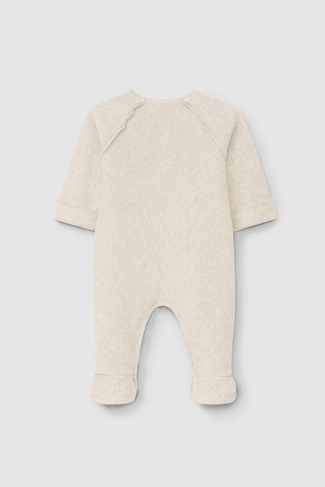 Prachtig baby pak met vast voetjes en sluiting aan de gehele onderkant met drukkers De voorkant met een houten knoopje