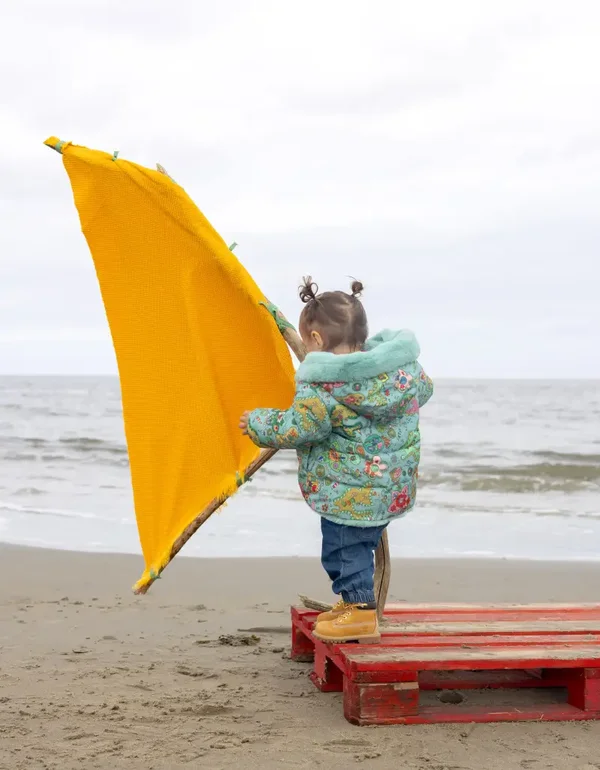 Deze heerlijke warme jas is dubbelzijdig te dragen, met fake fur aan één kant en de print Schokland Islands aan de andere kant. Dit dessin is een hommage aan het oud-Hollandse eiland in de Zuiderzee maar je vindt ook het Schotse monster Nessie terug tussen alle tekeningen. -Sluiting: Drukknopen -100% Recycled Polyester (buitenkant & vulling)