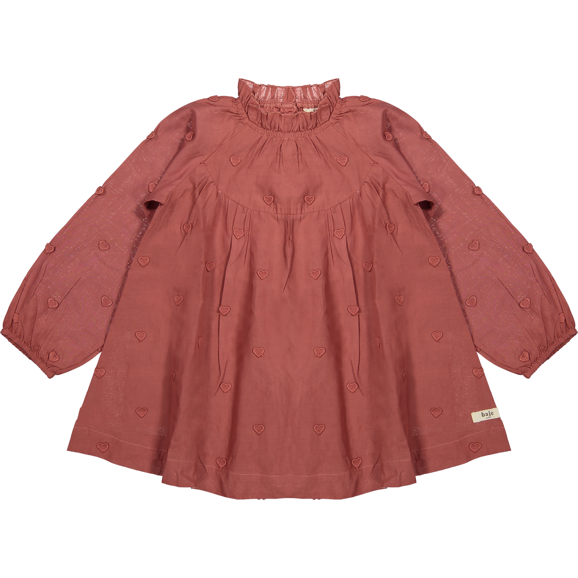 Geweven hartjes Meisjes jurk De Lajoux jurk van Baje Studio is de ultieme mix van eenvoud en verfijning. Gemaakt van zacht geweven katoen en versierd met subtiele hartjes, straalt deze jurk een speelse charme uit. De diepe rode kleur maakt het een echte eyecatcher, perfect voor zowel feestelijke gelegenheden als voor dagelijks gebruik. De ronde halslijn met een fijne ruffle en de licht gepofte mouwen geven de jurk een klassieke uitstraling. De losse pasvorm zorgt ervoor dat je meisje vrij kan bewegen en zich de hele dag comfortabel voelt. Combineer de jurk eenvoudig met een maillot en laarsjes voor een warme winterlook. ✔ Elegante rode jurk met subtiel hartjesmotief ✔ Comfortabele pasvorm dankzij zacht geweven katoen ✔ Ruffle detail bij de hals en speelse mouwen ✔ Perfect voor zowel feestdagen als schooldagen ✔ Ook prachtig te combineren met knitwear vestjes uit de collectie