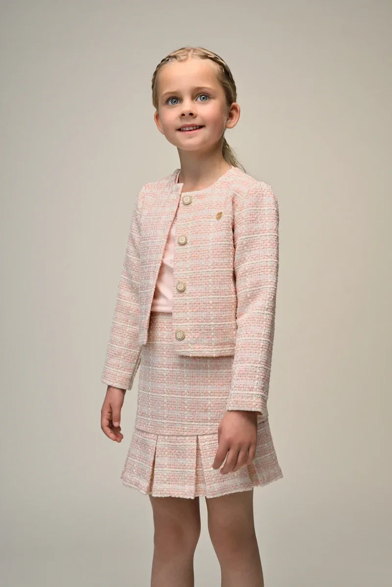 Maak elke outfit compleet met dit elegante AMSY tweed jasje in een prachtige roze tint. Dit jasje is perfect voor feestelijke gelegenheden en breng je dochter in de schijnwerpers!